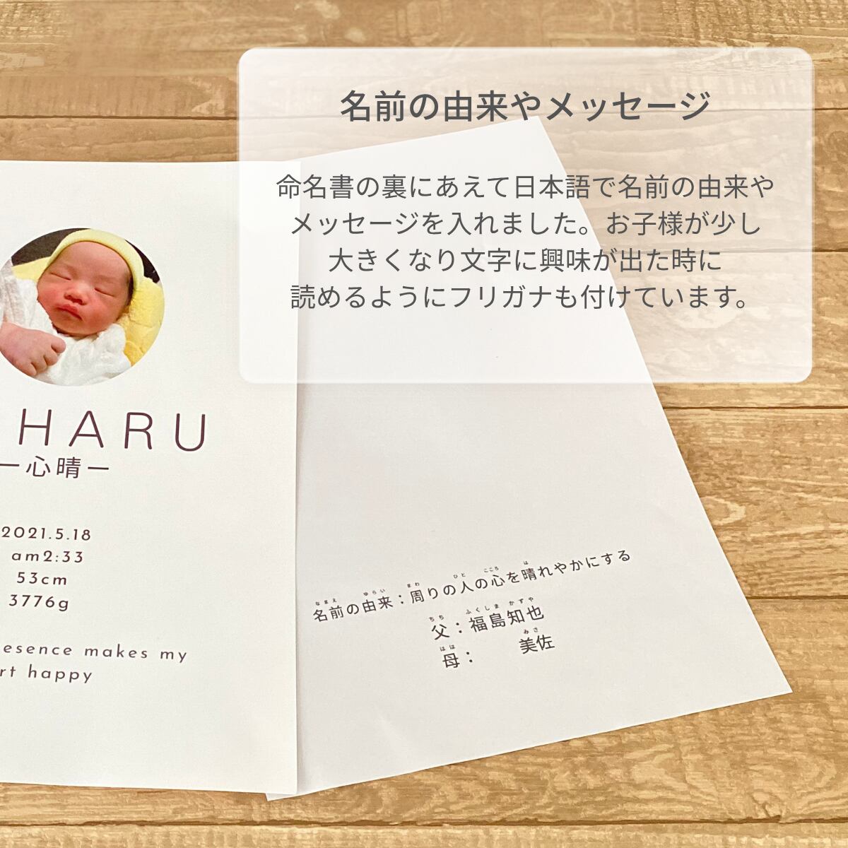 裏面には「お名前に込めた由来」を日本語でお入れすることができます。