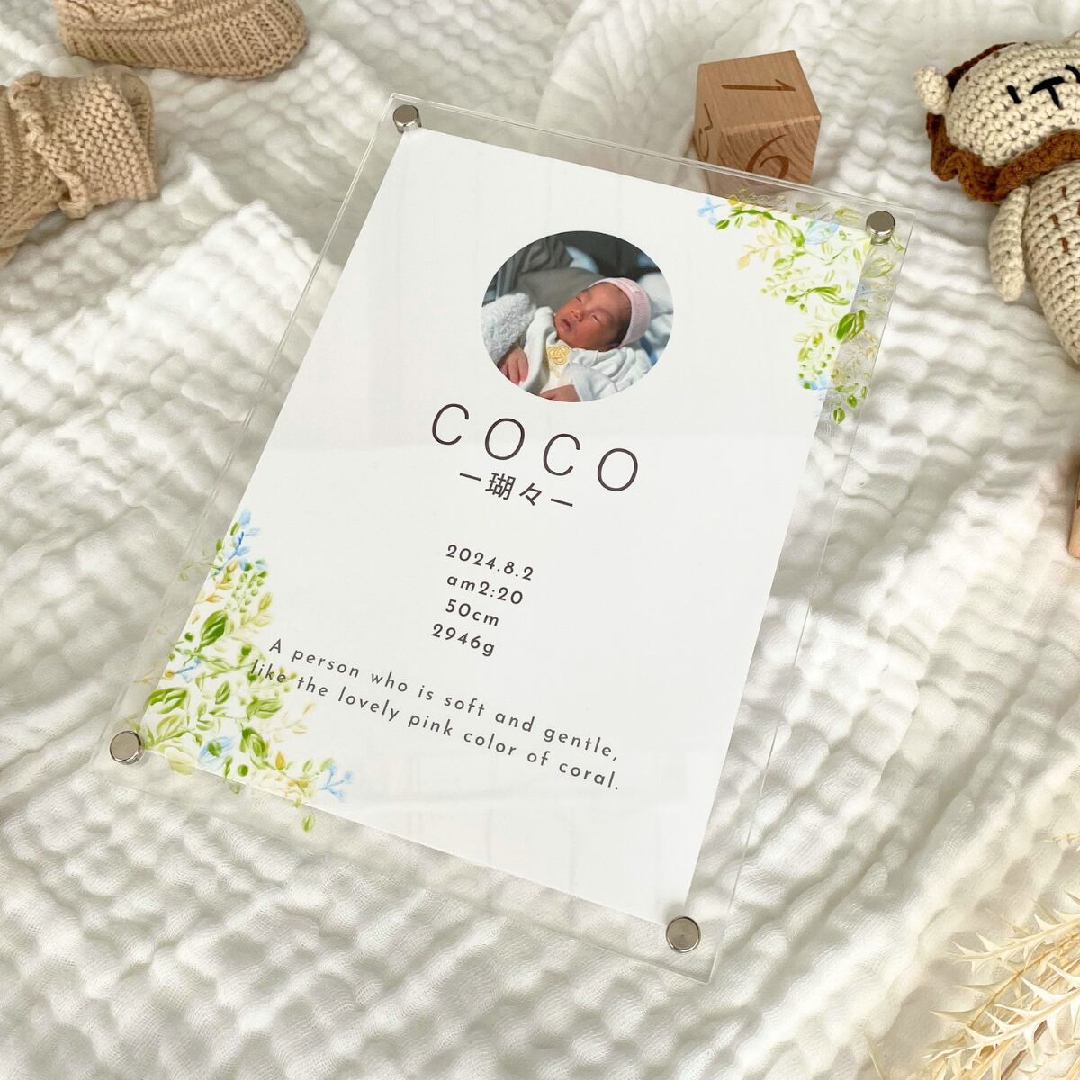 大切なお子さまのお名前を彩る、世界にひとつだけのアクリル命名書です。